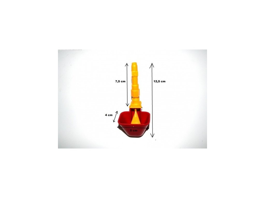 Plastová automatická napáječka pro kuřata a křepelky italské výroby. Kontrolu hladiny zajišťuje malý plovákový jazyk v napáječce, který dle potřeby otevírá či uzavírá ventil.