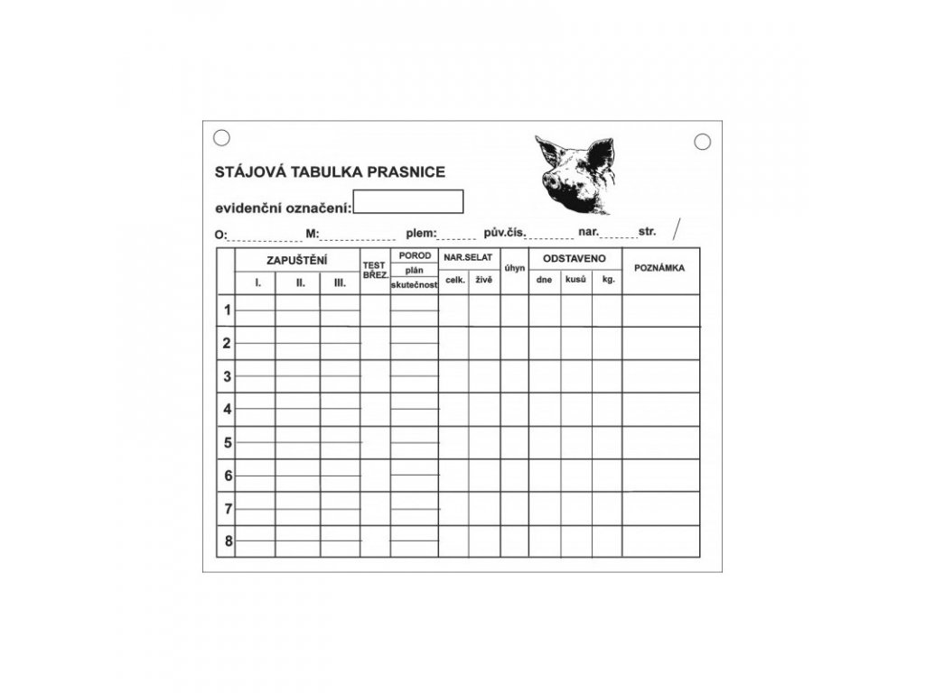 Praktické stájové tabulky pro prasnice, vyrobené z tvrzeného polystyrenu. Zapisování údajů je možné lihovými fixy. Zápis je odolný proti smývání vodou. Při změně prasnice lze smýt zápis lihem a tabulku použít pro novou prasnici. Na přání zákazníka lze vytisknout jakýkoliv motiv (s ohledem na množství).